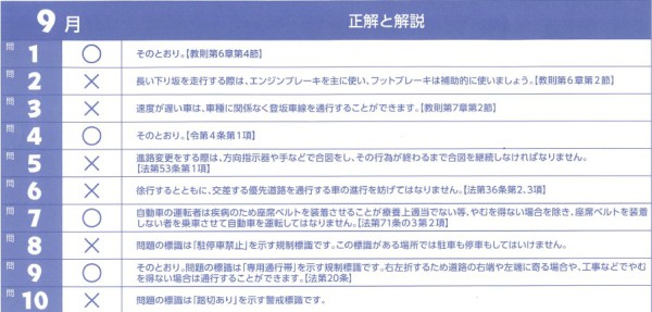 さて、9月の交通安全テストの回答とともに、秋の全国交通安全運動のお知らせです。