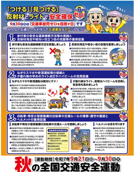 交通ルールの遵守も重要ですが、安全とマナーにも気遣ってほしいですね。気候は夏を感じることがまだまだ続きそうですが、天体の動きは秋に向かうことは変わらず、日没は早くなっています。そんなこんなで秋の交通安全運動では反射材とは早めのライト点灯を促しています。