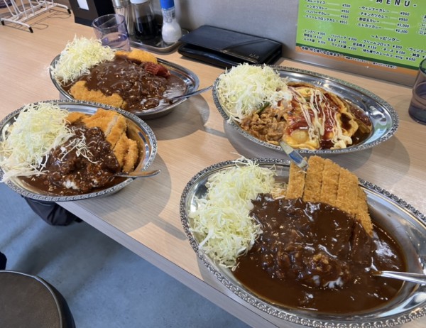 左上から時計回りに、満塁ホームランカレー、野菜玉カレー、トンカツカレー、チキンカツカレー。満塁ホームランカレーはカツ、ウインナー、ハンバーグにクリームコロッケ、ご飯の量は450か500グラムだったはず。