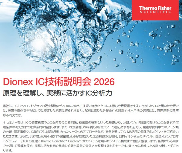 おはようございます。燃焼装置を用いたPFAS類AOF(吸着性有機フッ素)分析も可能なイオンクロマトグラフですが、毎年恒例の技術セミナーが開催されます。