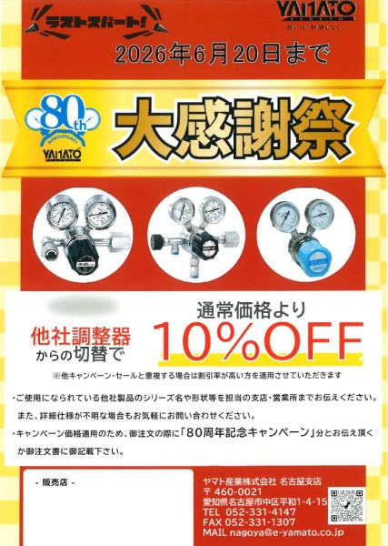 さて、今日はヤマト産業の大感謝祭についてお知らせします。なんでもヤマト産業は80周年経つようです。これを記念して、圧力調整器の10%OFFキャンペーンとなります。